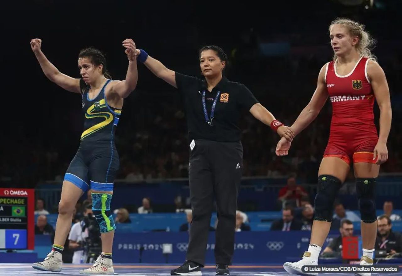 No wrestling, o atleta que perde nas quarta de final pode ser puxado automaticamente para a repescagem caso o adversário que o derrotou chegue à final. E foi justamente o que aconteceu. Nichita vai disputar o ouro contra um adversária do Japão, após derrotar Hong Kexin na semi. Com isso, Giullia foi puxada para a chave de repescagem, e ganhou o direito de lutar pela medalha de bronze. O Brasil nunca conquistou uma medalha olímpica na modalidade. O melhor resultado até então havia sido um 8º lugar de Rosângela Conceição nos Jogos de Pequim, em 2008.