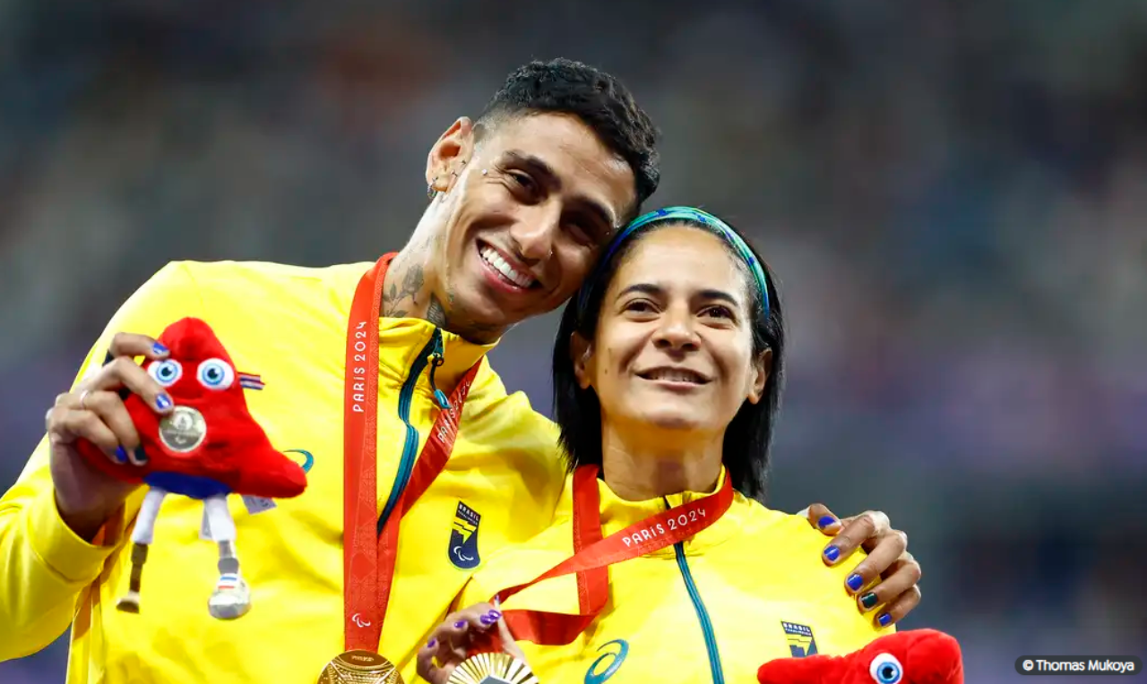 A atleta acreana Jerusa Geber (na foto ao lado do guia Gabriel Aparecido dos Santos Garcia), 42 anos, conquistou nesta terça-feira (3) a medalha de ouro nos 100m, da classe T11 (deficiência visual). Ela completou a prova em 11s83, superando a chinesa Cuiqing Liu, que ficou com a prata (12s04), e a paranaense Lorena Spoladore, que ficou com o bronze (12s14).